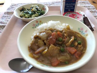 おおむぎごはん、牛乳(ミルメーク ココア)、チキンカレー、かいそうサラダ、いちごゼリー、