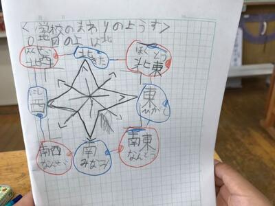 先生に教えてもらった方位をノートに写し、校舎内のいろいろな場所でその方位を確認しました。