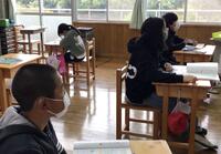 5年生は、先生が6年生を指導している間、出された課題を解いていました。