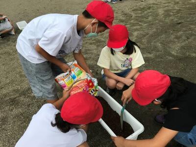 1年生も、余った土の袋を片付けていました。力持ち!