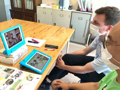 タブレットを使い、翻訳アプリで作業しました。