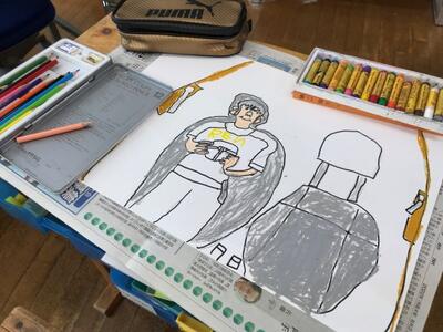 ポーズをきめた自分を写真に撮ってもらったり、背景になる場面を検索して参考にしたりと、タブレットを活用しながら描いていきました。