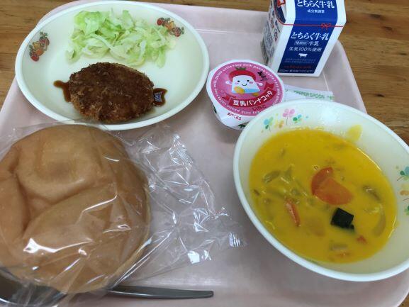 まるパン、牛乳、ボイルキャベツ、パンプキンシチュー、えびカツ、豆乳パンナコッタ