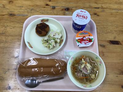 コッペパン、ツナサンドのぐ、メンチカツ、たまごスープ、のむヨーグルト、アセロラゼリー