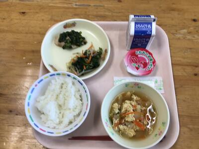 献立:ごはん、モロにらソースがけ、わふうあえ、かんぴょうのたまごとじじる、牛乳、とちおとめゼリー