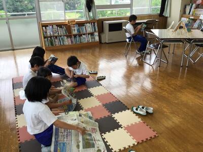 お話の本、恐竜の本、冒険のお話など魅力がいっぱいです。静かに集中して読んでいますね。「子ども新聞」から面白い記事を見つけたようです。