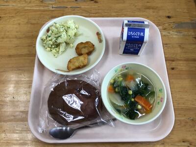 献立:ココアロール、牛乳、チキンナゲット、チーズポテト、ラビオリスープ