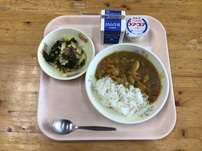 献立:おおむぎごはん、ポークカレー、かいそうサラダ、牛乳、ヨーグルト
