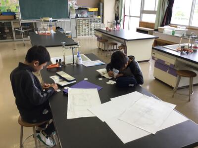 自分たちで見つけてきた自然・虫・鳥、植物を調べ、どの場所で生息しているか、見つけたかを地図で表す作業をしています。真剣です。