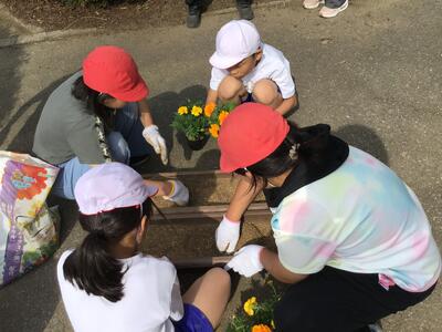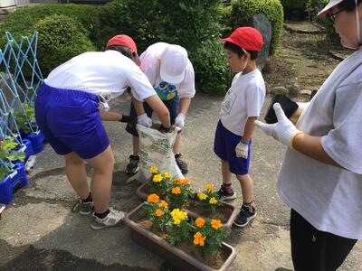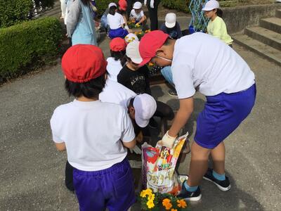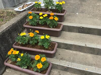 朝の活動の時間、マリーゴールド植えを行いました。縦割り班で協力して植えることができました。6年生がリーダーとなり、プランター設置から周りの片付けまでしっかりできました。昇降口前に飾られたプランターのおかげでとても華やかになりましたね。