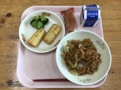 献立:やきそば、カレーふうみちくわてん、ボイルブロッコリー、メープルドック、牛乳