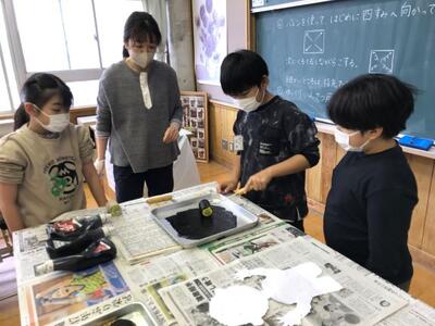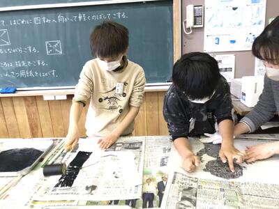 昨年度経験している4年生と、今年初めての3年生の混合グループなので、教えたり教わったり、学び合いながら活動しました。静かな空間の中、インクをおいたり、バレンでこすったり、丁寧に丁寧に作業しました。