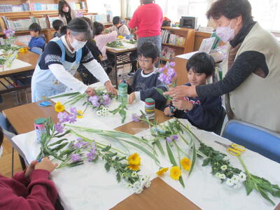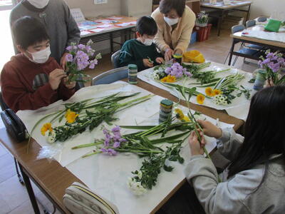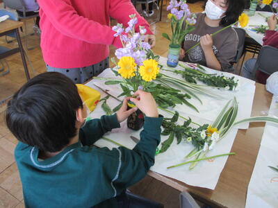 自分で作った花器に、思い思いに花を配置します。