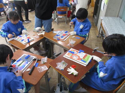 今日は、作品作りに金づちを使用しました。子どもたちは、少しだけ自力でやってみましたが、安全確保のため、たくさんの保護者の方に支援に入っていただきました。