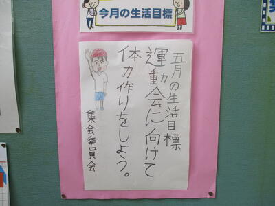 階段の「今月の生活目標」には、こんな掲示物がありました。