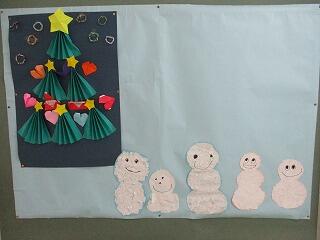 工事の関係で少し寂しい感じがする昇降口ですが、ALTのシェラリン先生が、全校生の手形をモチーフにしてクリスマスツリーを作ってくれました。近くの個別学習教室にもツリーとかわいい雪だるまが貼ってありました。クリスマスは、みんなが温かい気持ちになれる素敵な日ですね。