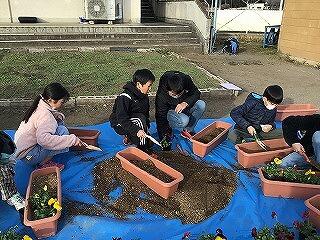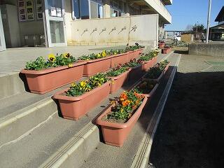 美化委員会がプランターにパンジーを植えて昇降口に置いてくれました。以前植えた葉ボタンとあわせて、毎朝子どもたちを温かく迎えてくれています。また、体育委員会は、なわとび練習台を出してくれました。早速、休み時間に子どもたちが楽しそうになわとびの練習をしていました。みんなが楽しく学校生活を送れるように、これからも委員会活動をがんばってください。