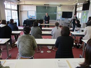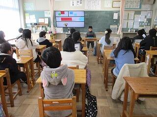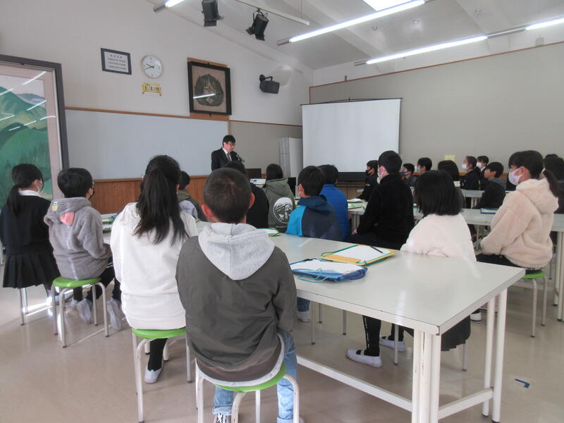 中学校の先生や生徒会役員の人から、中学校の生活や部活動のことなどのお話を聞きました。熱心に耳を傾け、メモを取っていました。その後、班ごとに授業を見学しました。興味津々に中学校の授業を見学していました。