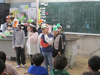 2年生が、国語の教科書に載っている「お手紙」を音読劇にして、1年生に見せてくれました。どの子も音読が上手で、「かえるくん」や「がまくん」の気持ちが伝わってきました。また、1年生も見る態度が立派で、感想をしっかり発表することができました。「お手紙」の最後の場面のように幸せな気持ちになる時間でした。