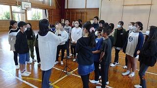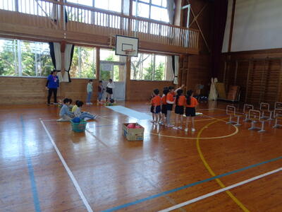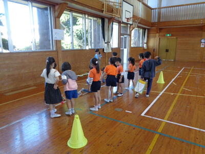 今日は、体育館で1年生と保育園年長児との交流を行いました。