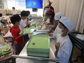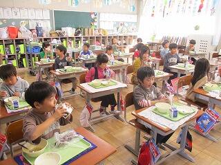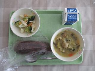 献立が「ココアパン」だったとき、給食に本当の「ココアパン」がでたら、「ココア揚げパン」だと勘違いしていた子どもたちから落胆の声があがりました。しかし、今日は正真正銘の「ココア揚げパン」がでたので、子どもたちは大喜びでした。口の周りを真っ黒にした写真を期待しましたが、1年生も上手に食べていて感心しました。