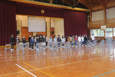 5年生が卒業式会場準備をしました。卒業式の時に、保護者の方が座るイスを準備したり、暗幕を閉めたりしました。