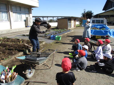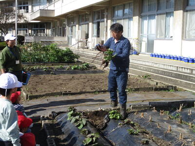 教頭先生から土の中の芋の様子と芋の掘り方を教わります。