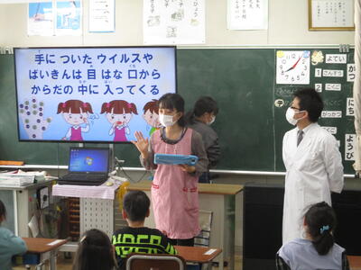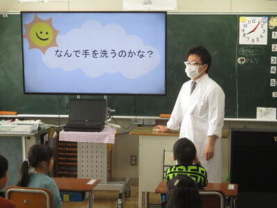 学活の時間に学校薬剤師様より手洗い指導をしていただきました。