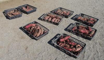 スコップで芋を掘り上げる人、掘り上げた芋を一つ一つばらばらにしてかごに運ぶ人など仕事を分担します。