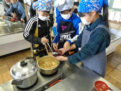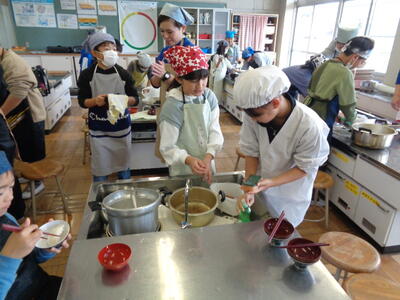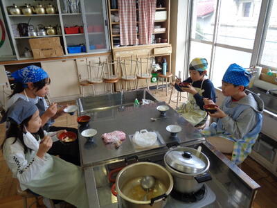 5年生たちは、朝からにこにこでした。2~3時間目を通して、ごはんとみそ汁を作ります。