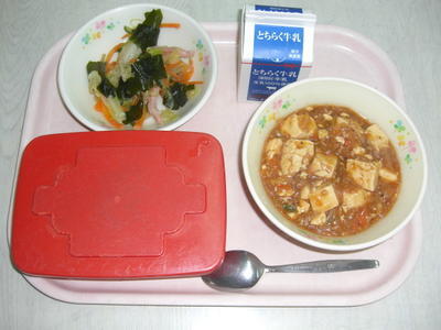 今日の給食はご飯、牛乳、麻婆豆腐、中華あえでした。
