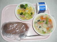 今日の給食はココア揚げパン、ポトフ、ミモザサラダでした。