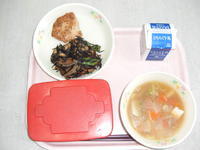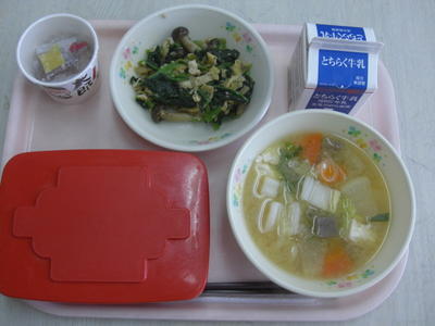 今日の給食はご飯、牛乳、納豆、小松菜と油揚げとしめじのゴマ炒め、石狩汁でした。