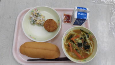 今日の給食はコッペパン、牛乳、ポークミンチカツ、ツナと大豆のサラダ、カレーうどんでした。