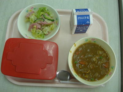 今日の給食は大麦ご飯、牛乳、ポークカレー、ハムマリネサラダでした。