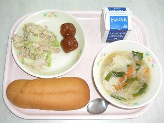 給食は、コッペパン、セルフツナサンド、肉団子、ワンタンスープ、牛乳でした。
