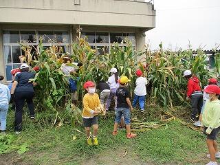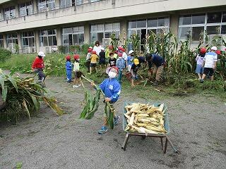 2年生が育てていたトウモロコシを収穫しました。校舎前の教材園は夏休みの間すごいことになっていましたが、たくさんトウモロコシがとれて子どもたちは大喜びでした。自分の背より高く育ったトウモロコシの間に入って収穫する姿がとても微笑ましかったです。とったトウモロコシがこの後どうなるのか気になるところです!?