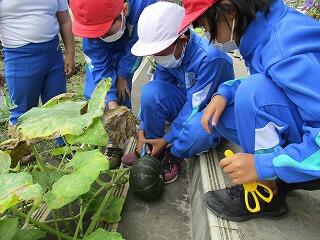 2年生の収穫が終わった後、となりの教材園に3年生がスイカとカボチャをとりに出てきました。スイカは小ぶりだったようですが、しっかりしたカボチャがたくさんとれました。小さな種が1年でこんなに育つなんて、あらためて自然のすごさを感じずにはいられませんでした。そして、やっぱりとれたカボチャがどうなるのか気になってしまいました!?