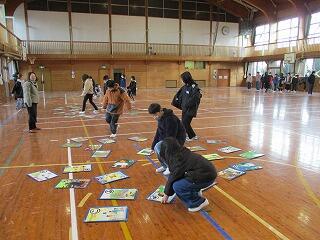 今まで控えていた大カルタを久しぶりにやりました。これは石川をテーマにKLVのみなさんが作ってくれたものです。底冷えのする体育館でしたが、5・6年生が元気にカルタに向かってダッシュしていました。他の学年も教室でカルタを楽しみました。