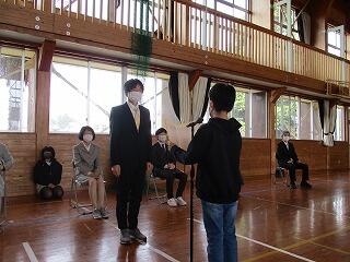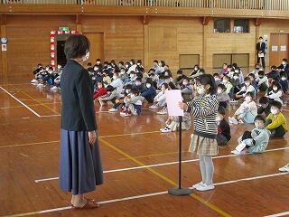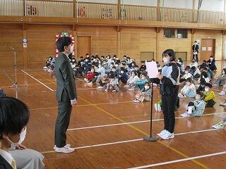 全校生が体育館に集まって離任式を行いました。異動される先生方と子どもたちが顔と顔をあわせて、お別れをすることができました。それぞれにしっかり心に区切りをつけることができてよかったと思います。離任式終了後、異動する先生方にPTAから花束をいただきました。この場をお借りして、PTAの皆様にお礼申し上げます。