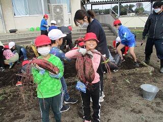 2年生がさつまいも掘りをしました。さつまいもは、土の中に隠れているので、どのぐらい育っているかは、掘ってみないとわかりません。みんなわくわくして土をよけ始めましたが、すぐに歓声があがりました。大きな(太い?)おいもがたくさんとれて、みんな大喜びでした。
