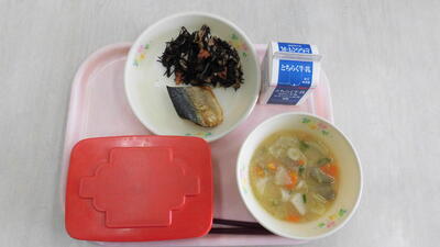 今日の給食はご飯、牛乳、さば文化干し、いそ煮、根菜ごま汁でした。