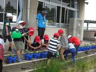 2年生が生活科の学習で、キュウリ、ミニトマト、ナス、ピーマンの苗を植えました。一人一鉢なので、これからしっかりお世話をしたいと張り切っていました。観察カードにしっかり記録もできました。これからどのように育っていくのか楽しみですね。