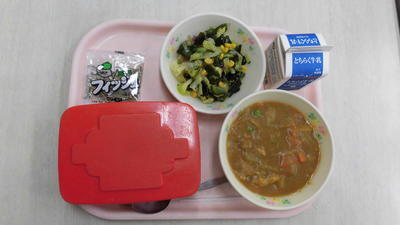 今日の給食は牛乳、大麦ご飯、ポークカレー、海草サラダ、ミニフィッシュでした。