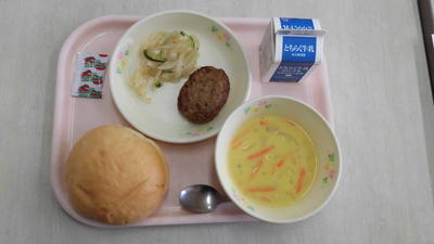 今日の給食はまるパン、牛乳、ハンバーグケチャップかけ、コーンポタージュ、大根サラダでした。