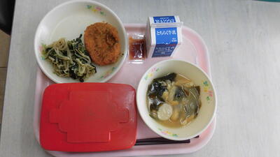 今日の給食はご飯、牛乳、コロッケまたはカレーコロッケ、ごまあえ、みそ汁でした。(セレクト給食)