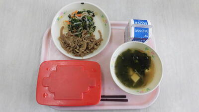 今日の給食はご飯、牛乳、ビビンバの具、韓国風スープでした。