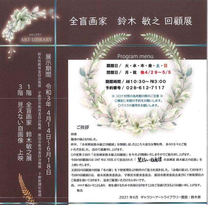 4月に鹿沼市教育委員会教育長職務代理者 鈴木泉氏より「全盲画家 鈴木敏之回顧展」のご案内と書籍及びDVDを寄贈していただきました。遅ればせながら先日の日曜日に回顧展を観てきましたが、鹿沼にこのような素晴らしい方がいらっしゃたことを知らずにいたことを恥ずかしく思いました。6月18日まで宇都宮のコクカビル「ギャラリーアートライブラリ」で回顧展をやっていますので、ぜひご覧になってください。コロナ対策のため事前に予約が必要です。