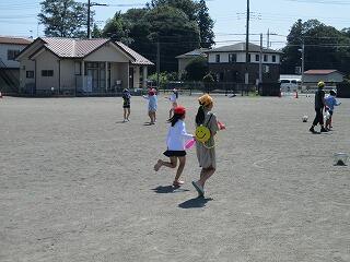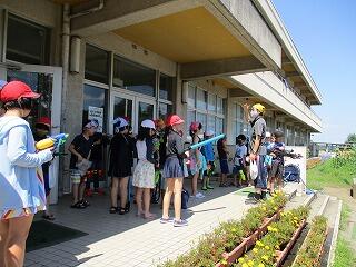 4年生が自分たちでお楽しみ会の計画を立てて、「水合戦?」をやっていました。雨空から一転して暑い日が続いているので、水に触れるだけで気持ちよさそうでした。セミの声は小さめですが、青空を見上げるといよいよ夏休みという感じがしてきます。