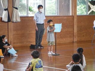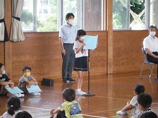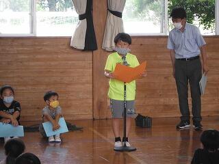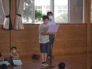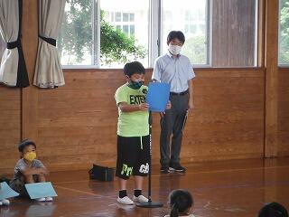 業間に体育館で終業式を行いました。「めあて」と「ふりかえり」の大切さを話しましたが、代表児童の「1学期をふりかえって」の発表はとても立派で成長を感じました。いよいよ明日から夏休みになります。事故や病気に気をつけて楽しい夏休みにしてほしいと願っています。2学期の始業式にみなさんの元気な笑顔が見られることを楽しみしています。